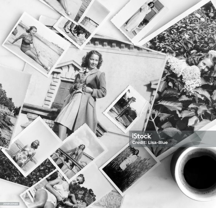 Genealogy family history theme with vintage photos. 1940.
